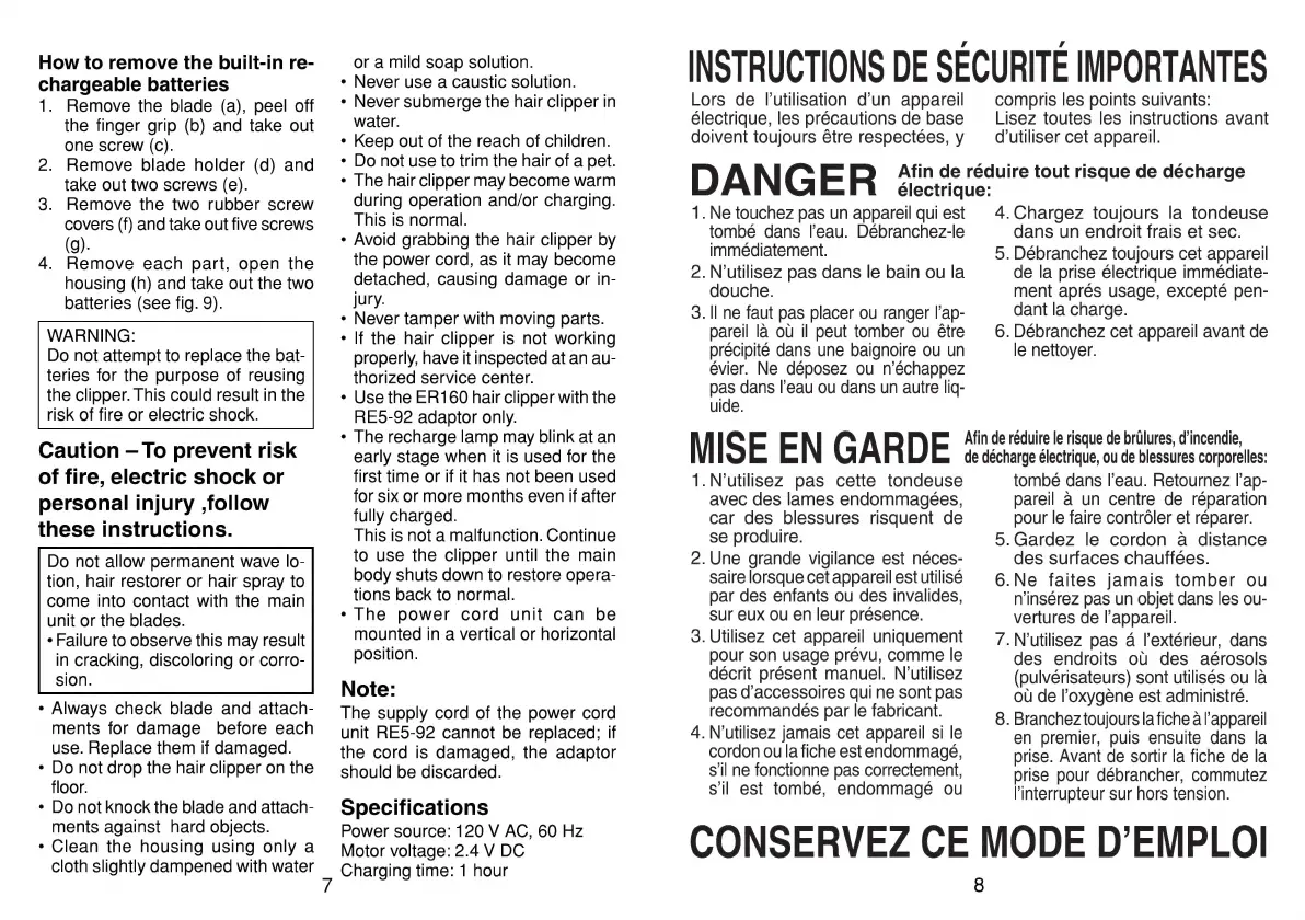 Panasonic ER160 - Specifications; Instructions de Securite Importantes