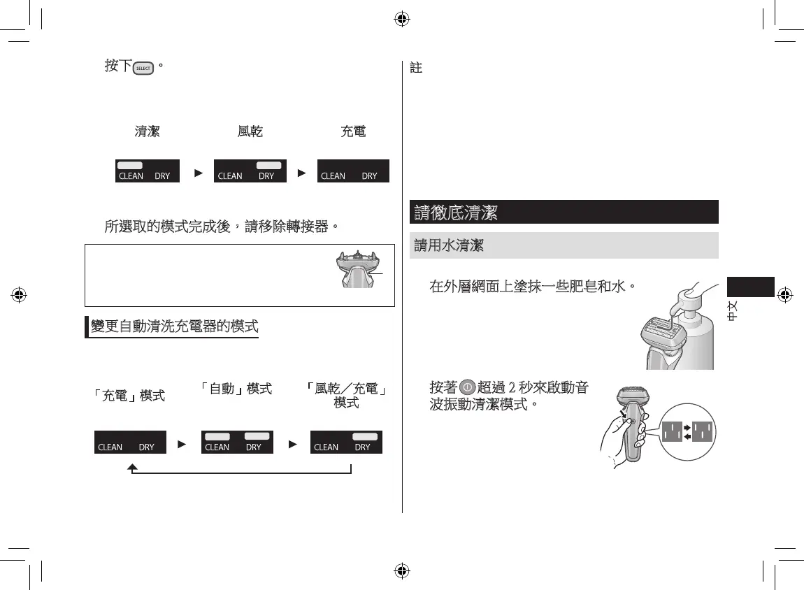 裝上鬚刨時,會啟動「充電」模式,並可按下選擇按鈕
