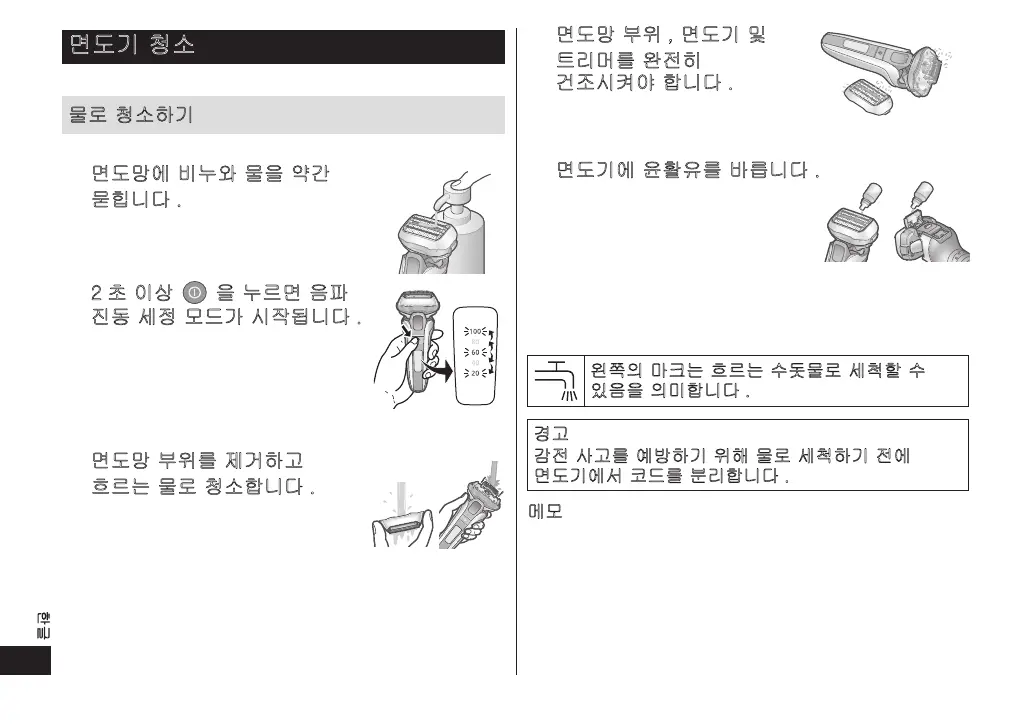 • 물로 헹군 후 면도기를 아래 위로 몇 번 흔들어서