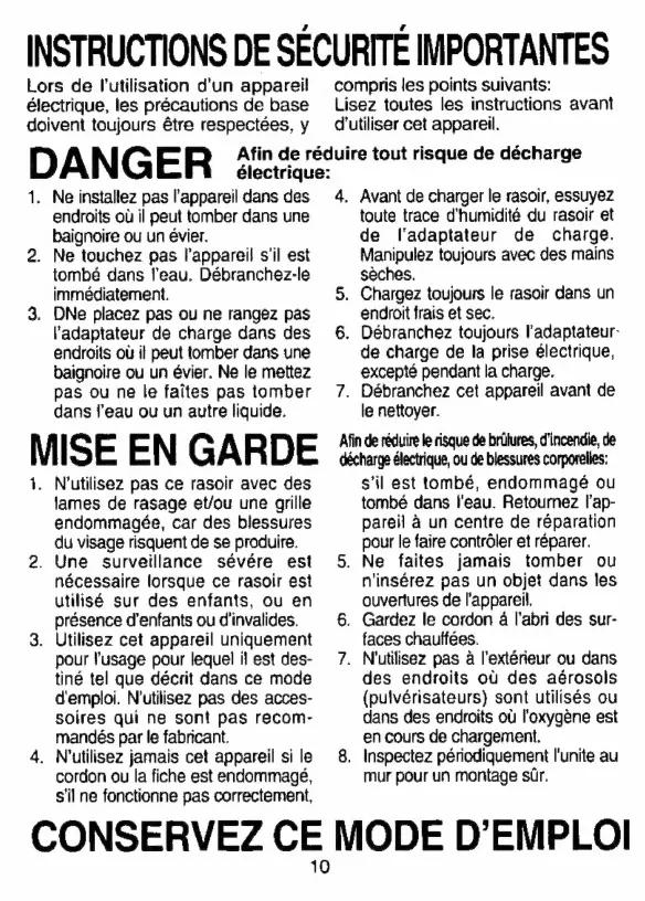 Panasonic ES8066 - Instructions de Sécurité Importantes