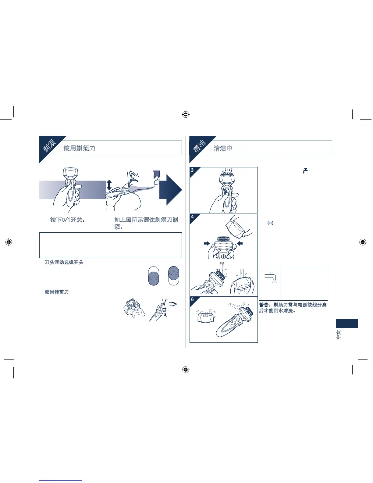 须生长方向前后移动剃须刀。当皮肤适应剃须刀之后您可以稍