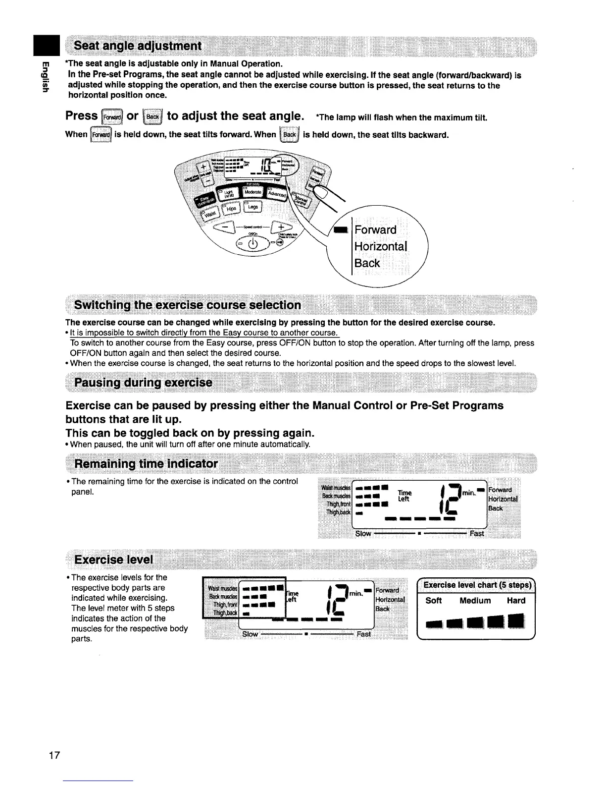 Panasonic EU7805K - Seat Angle Adjustment; Switching the Exercise Course Selection; Pausing During Exercise; Remaining Time Indicator