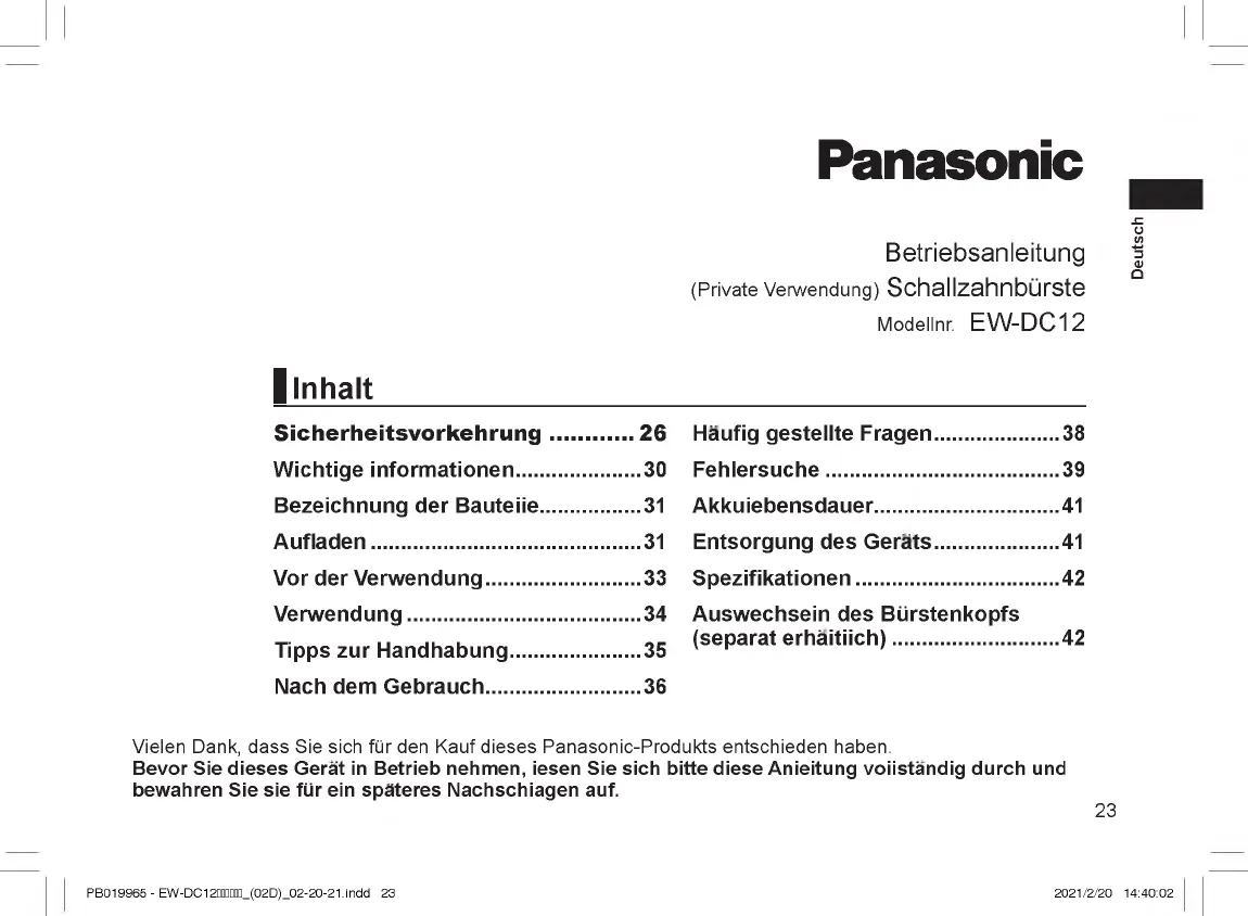 Vielen Dank, dass Sie sich für den Kauf dieses Panasonic-Produkts entschieden haben.