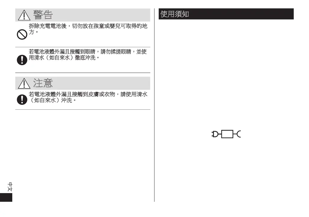 若電池液體外漏且接觸到皮膚或衣物,請使用清水