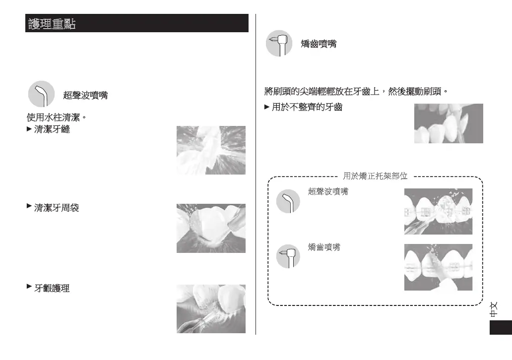 以刷頭及水流清潔不整齊的牙齒,及清潔矯正托架部位