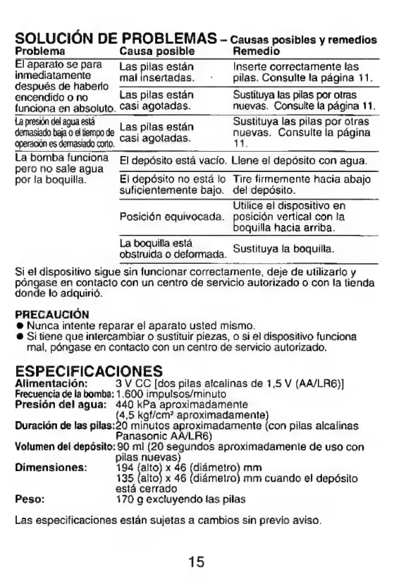 Panasonic EW176 - Especificaciones