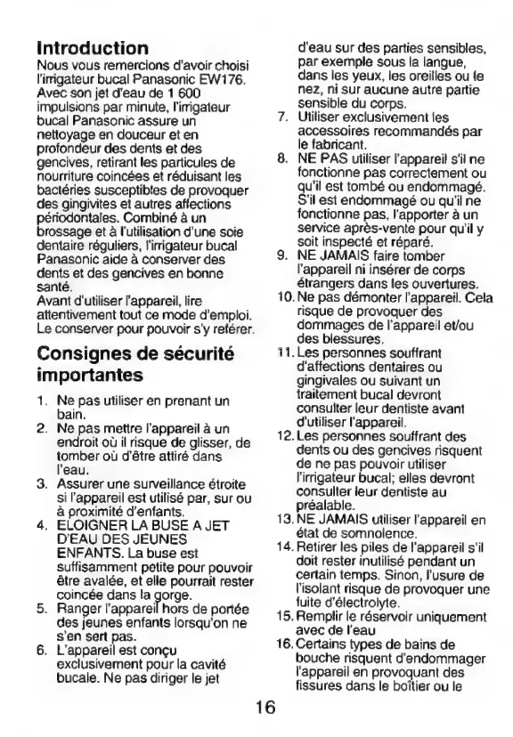 Panasonic EW176 - Consignes de Sécurité Importantes