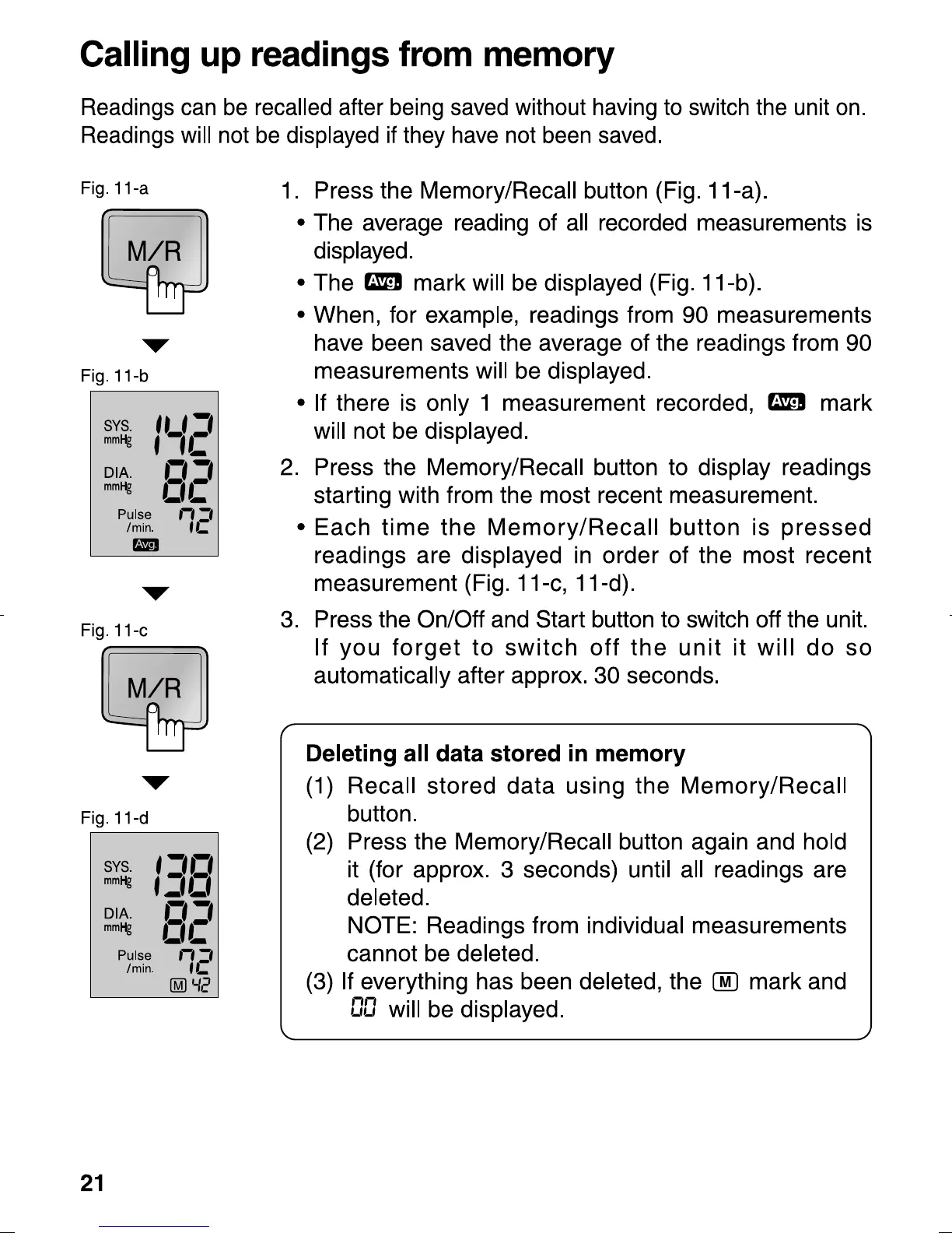 Panasonic EW3006S - Calling up Readings from Memory; Deleting All Data Stored in Memory