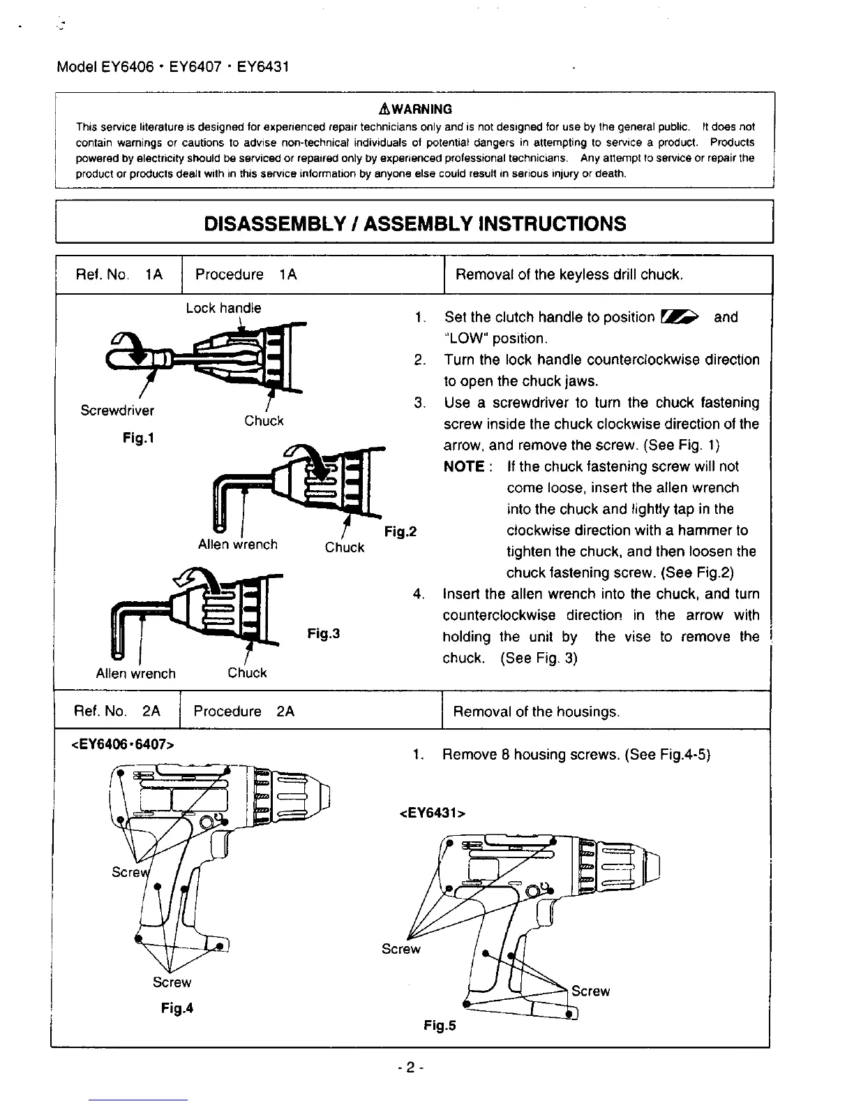 Panasonic EY6431 - Disassembly and Assembly Instructions - Chuck and Housing; Keyless Drill Chuck Removal; Housing Removal