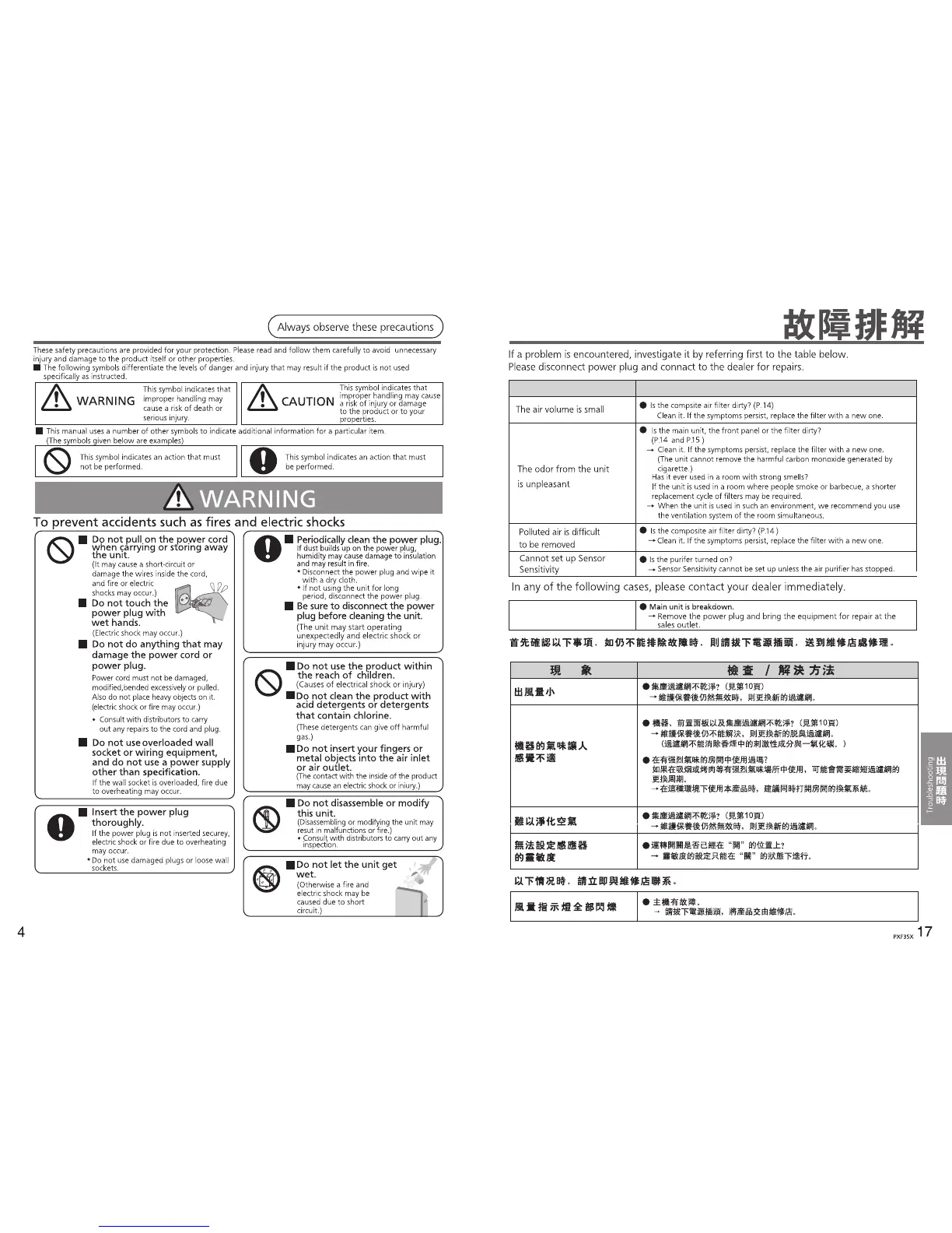 Panasonic F-PXF35X - Safety Precautions; Troubleshooting