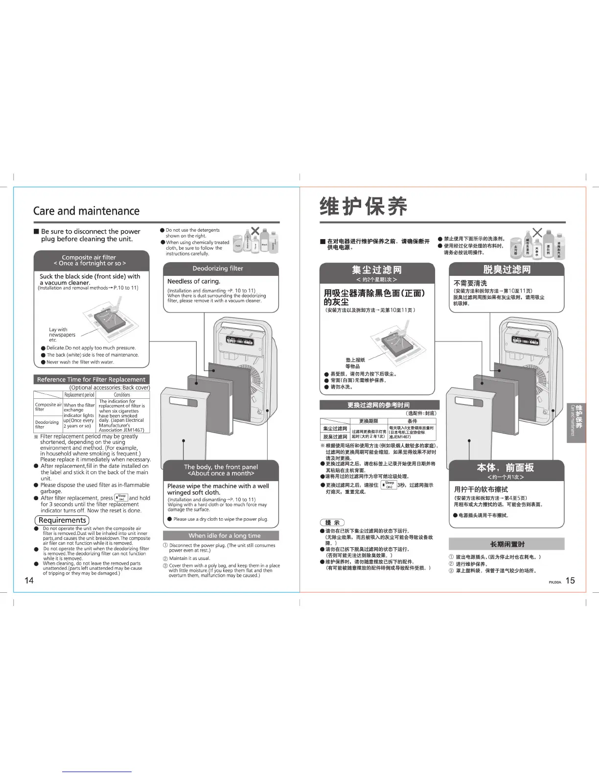 Panasonic F-PXJ30A - Care and Maintenance; Filter Replacement and Cleaning; Unit Cleaning and Long-Term Storage