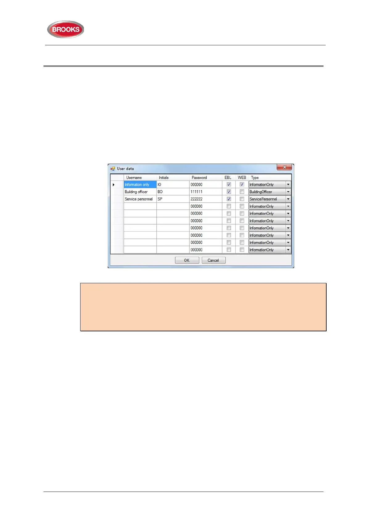 Each user has a password for an access level e.g. "Information only", "Building officer" or