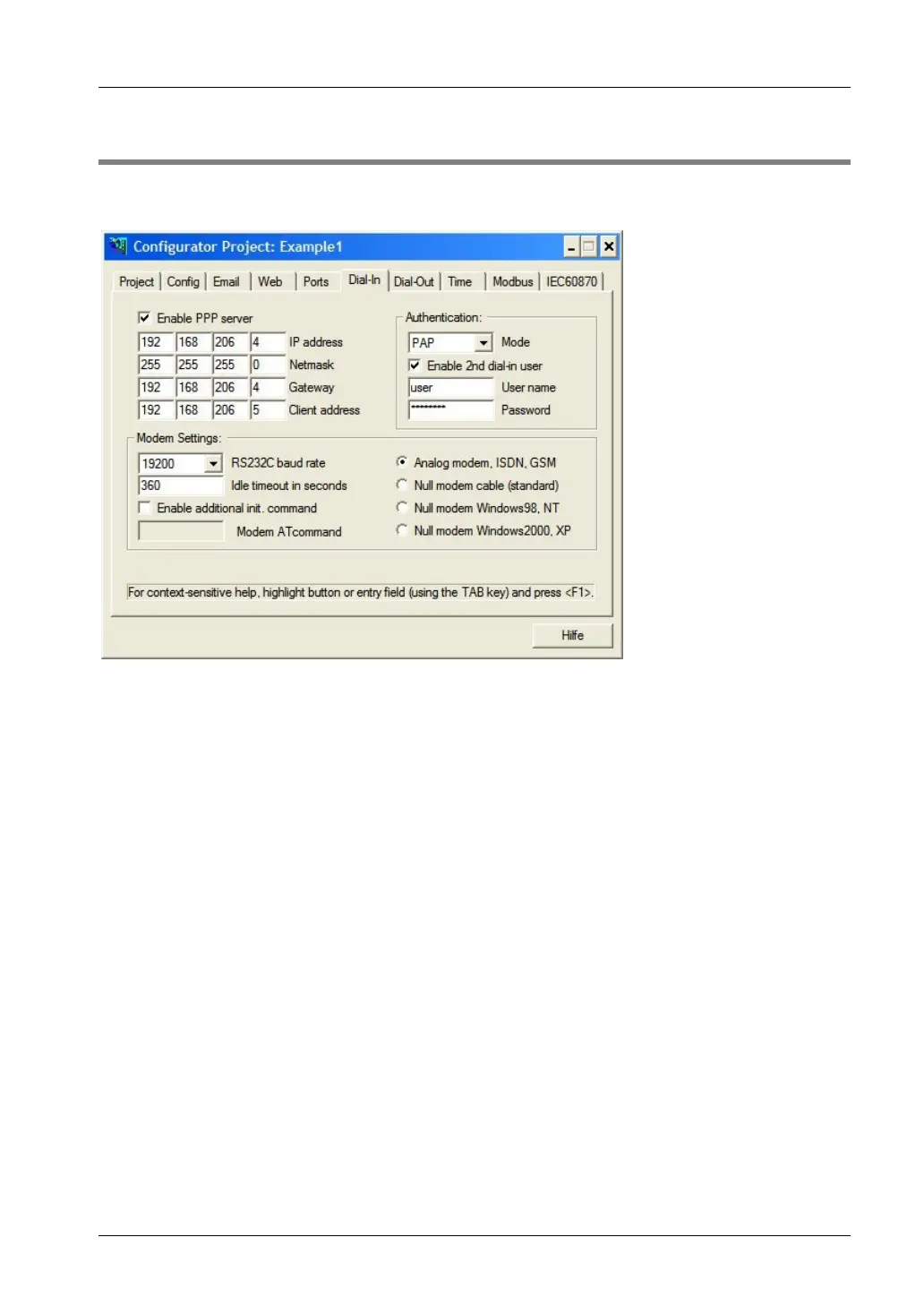 In the following, the input fields of the "Dial-In" tab of the Configurator for the PPP-Server