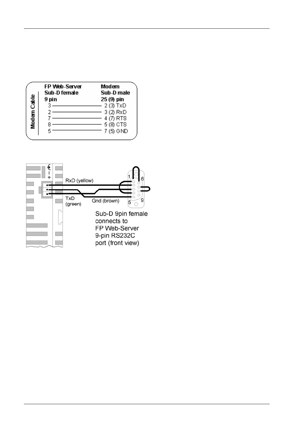 Use a standard computer/ modem cable to connect the FP Web-Server to a modem: