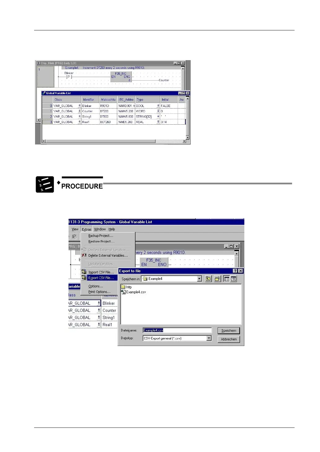 Carry out the following steps in FPWIN Pro to export the global variable list as a CSV file: