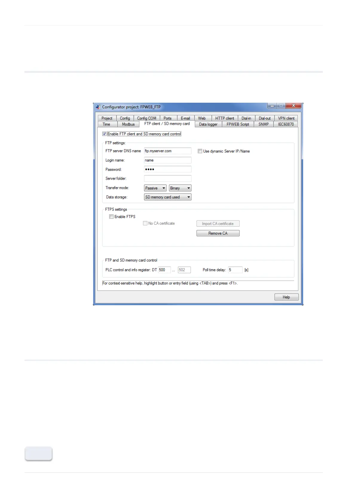 The input fields for the tab "FTP client / SD control tab" are described in