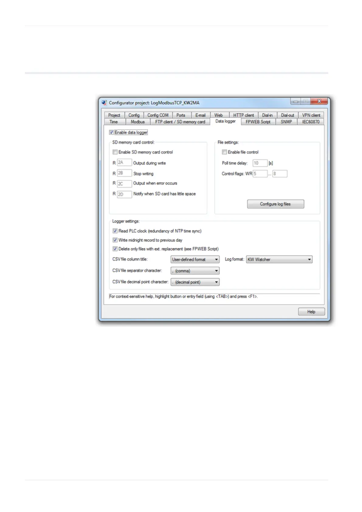 In this section, the input fields on the "Data logger" tab are described.