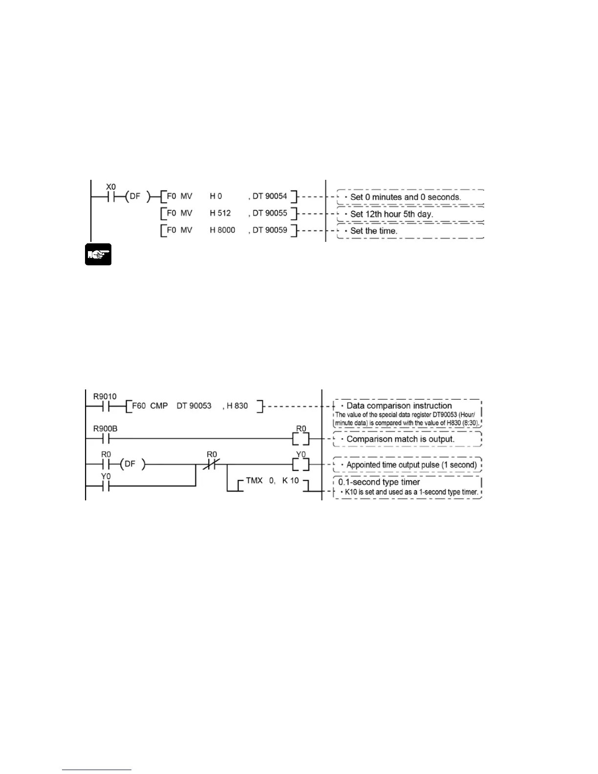Here, the “Hour/minute” data stored in the special data register DT90053 is used to output the signal at