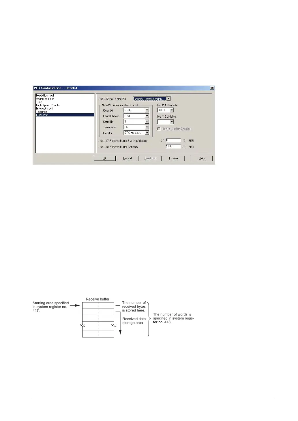 of words) using No.418. The receive buffer layout is shown below.
