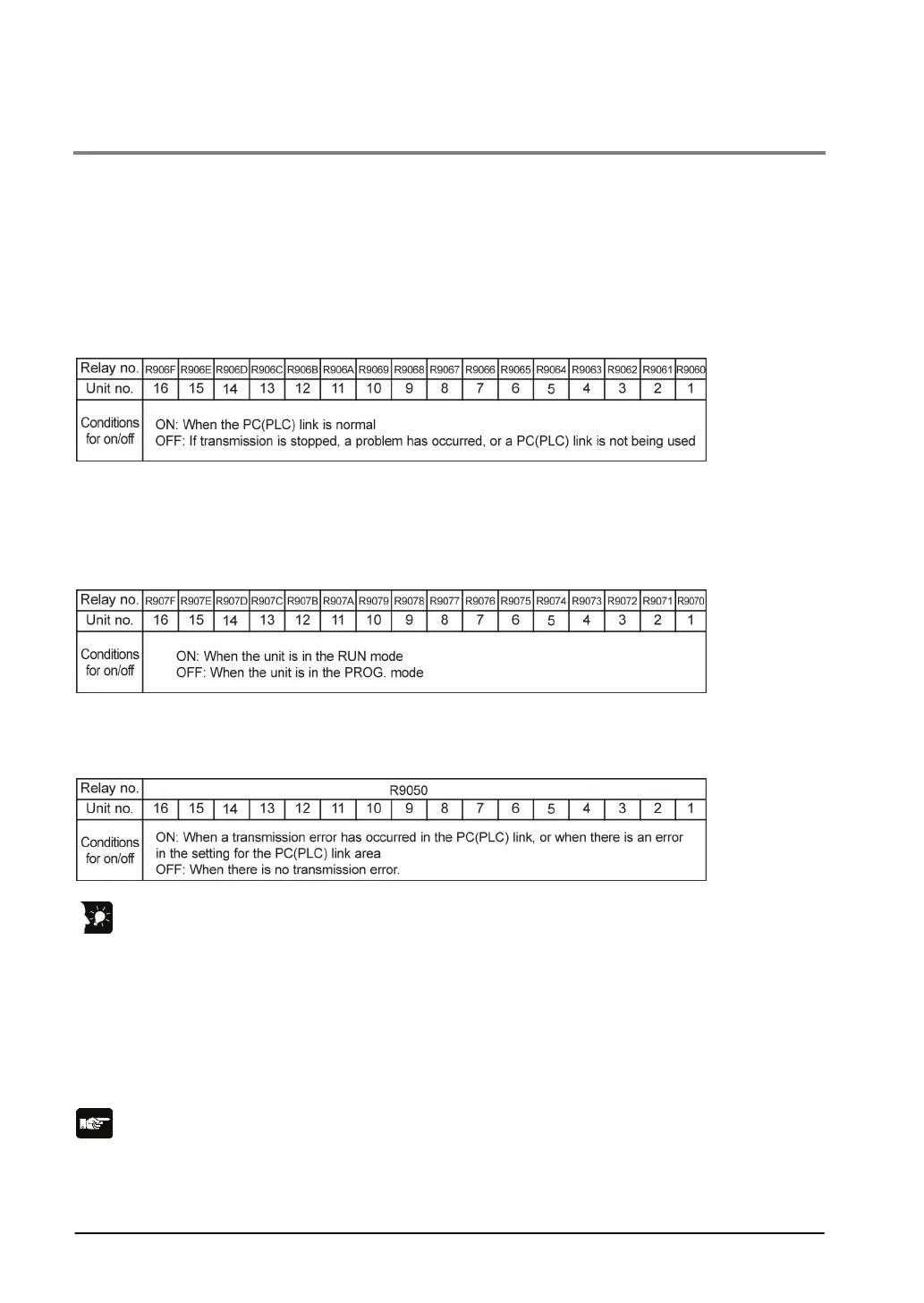 For PC(PLC) link 1: R9080 to R908F (correspond to unit no. 1 to 16)