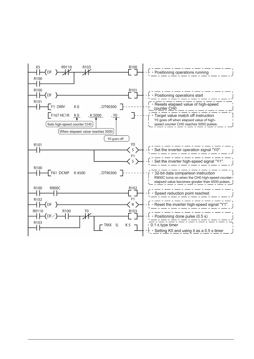 (DT90300 and DT90301) reaches K4500, Y1 turns off and the conveyor begins decelerating. When the