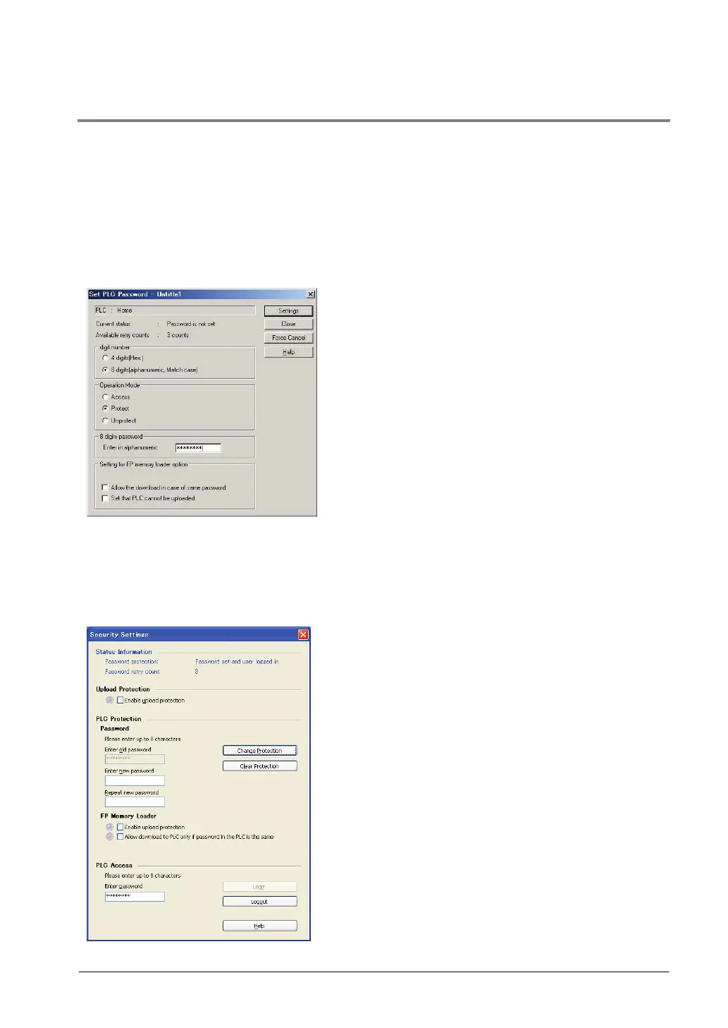 Enter a password in the “Set PLC Password” menu (FPWIN GR), “Security settings” menu (FPWIN Pro)