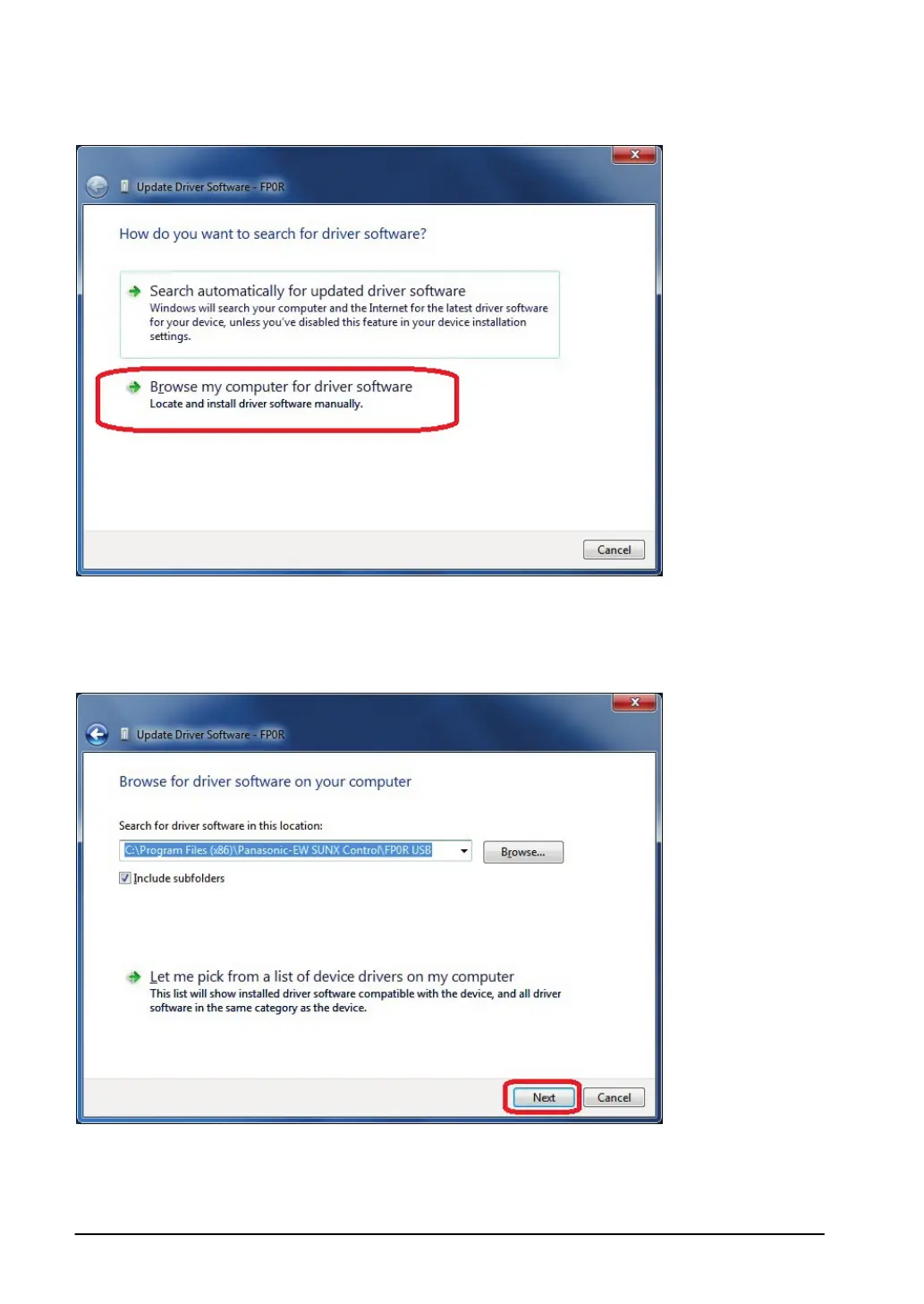 7. Click the "Browse..." button to specify the folder that the USB driver of FP0R has been stored, and