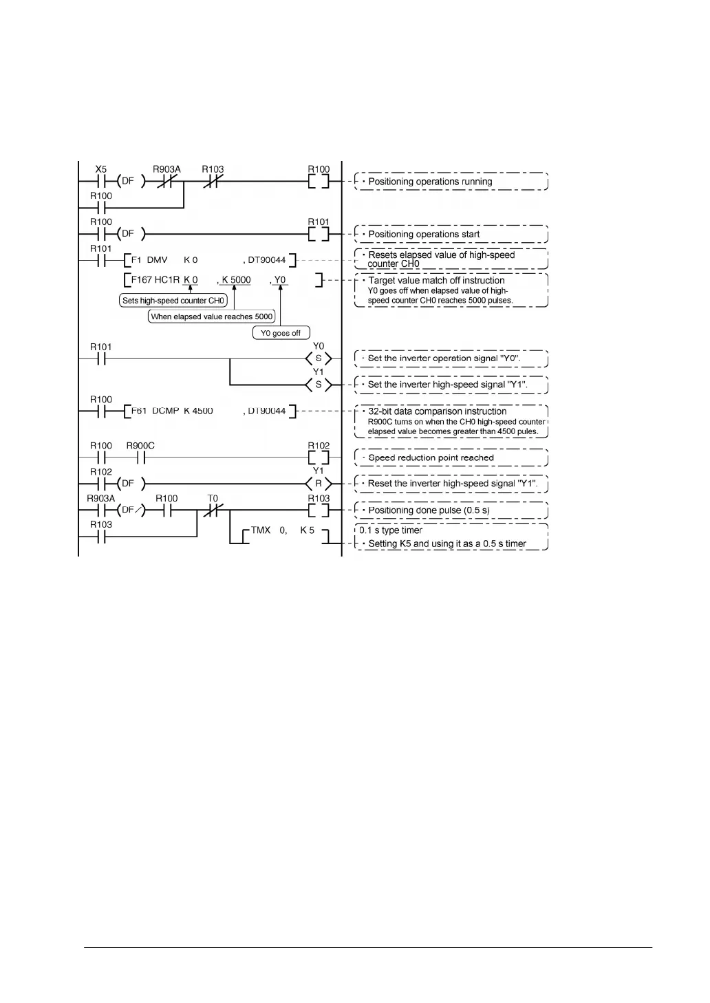 (DT90044 and DT90045) reaches K4500, Y1 turns off and the conveyor begins decelerating. When the