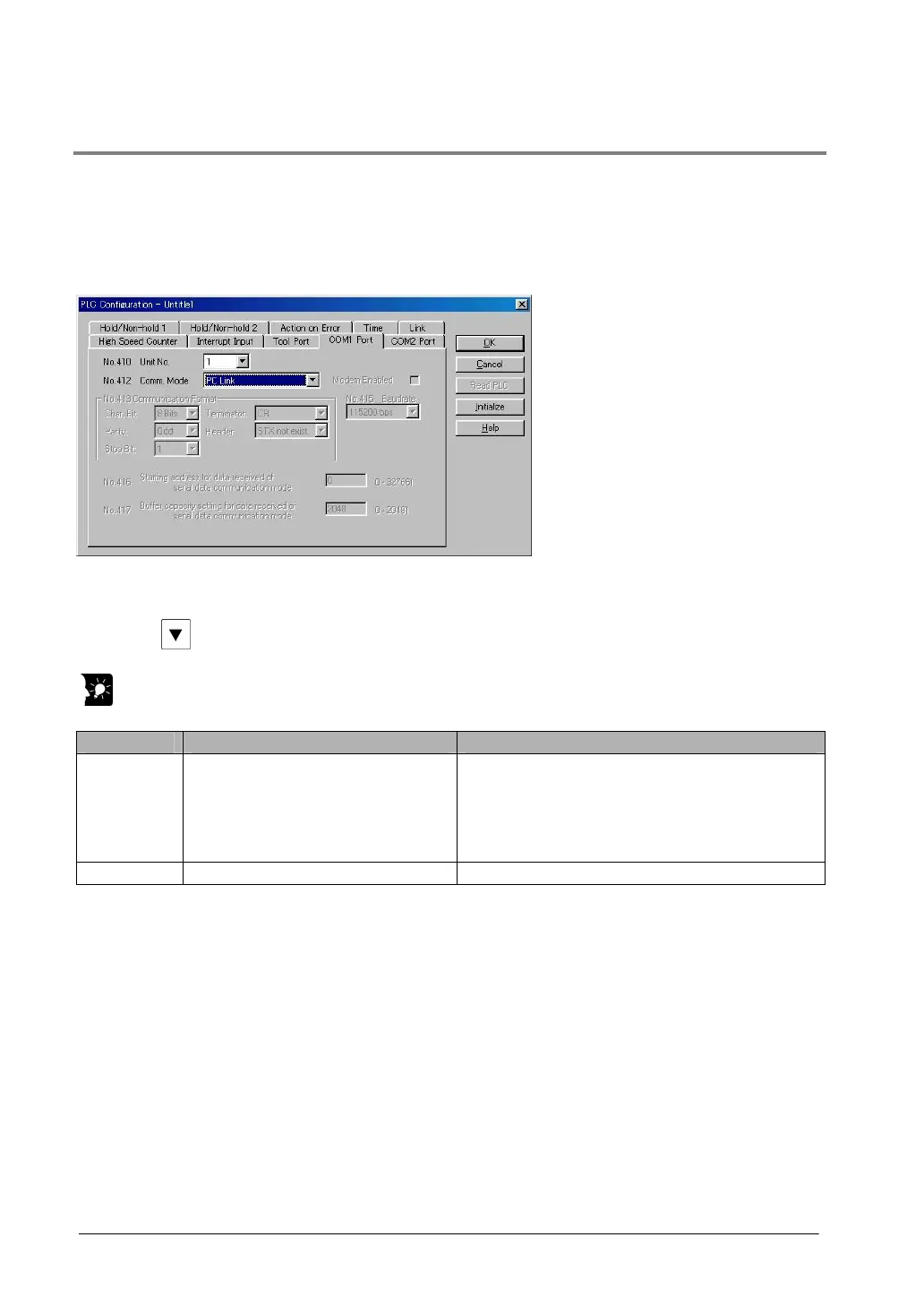 “Options”, and then select “COM1 port” tab. (The PC(PLC) link is available for COM1 port only.)