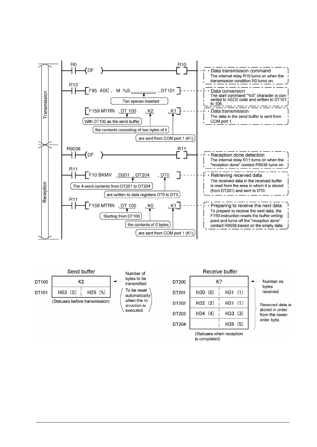 The following shows the statuses of the send and receive buffers when the sample program is run.