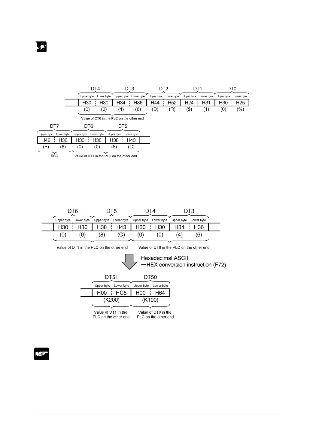 If K100 is stored in DT0 and K200 is stored in DT1 of the FP series PLC on the other end,