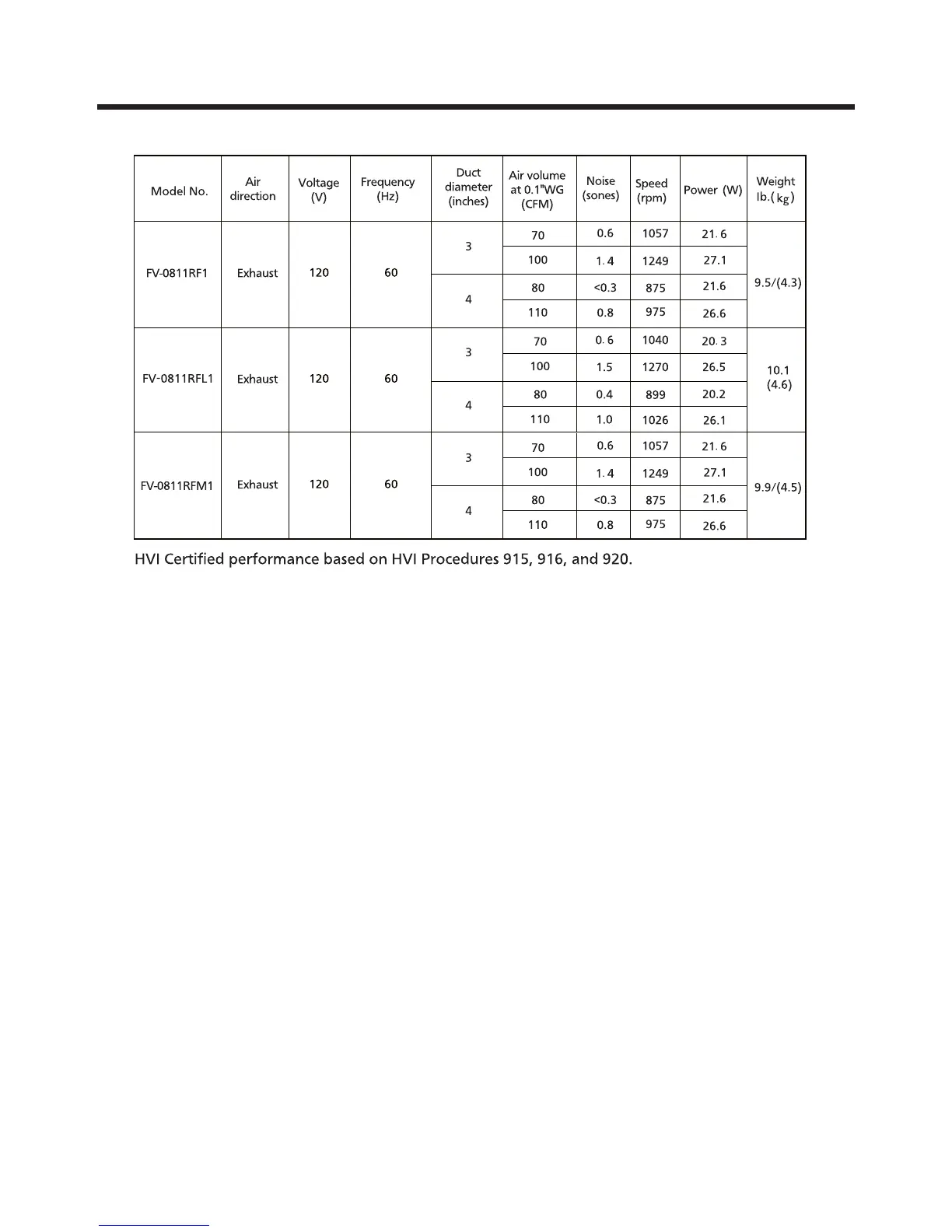 Panasonic FV-0811RF1 - Specifications