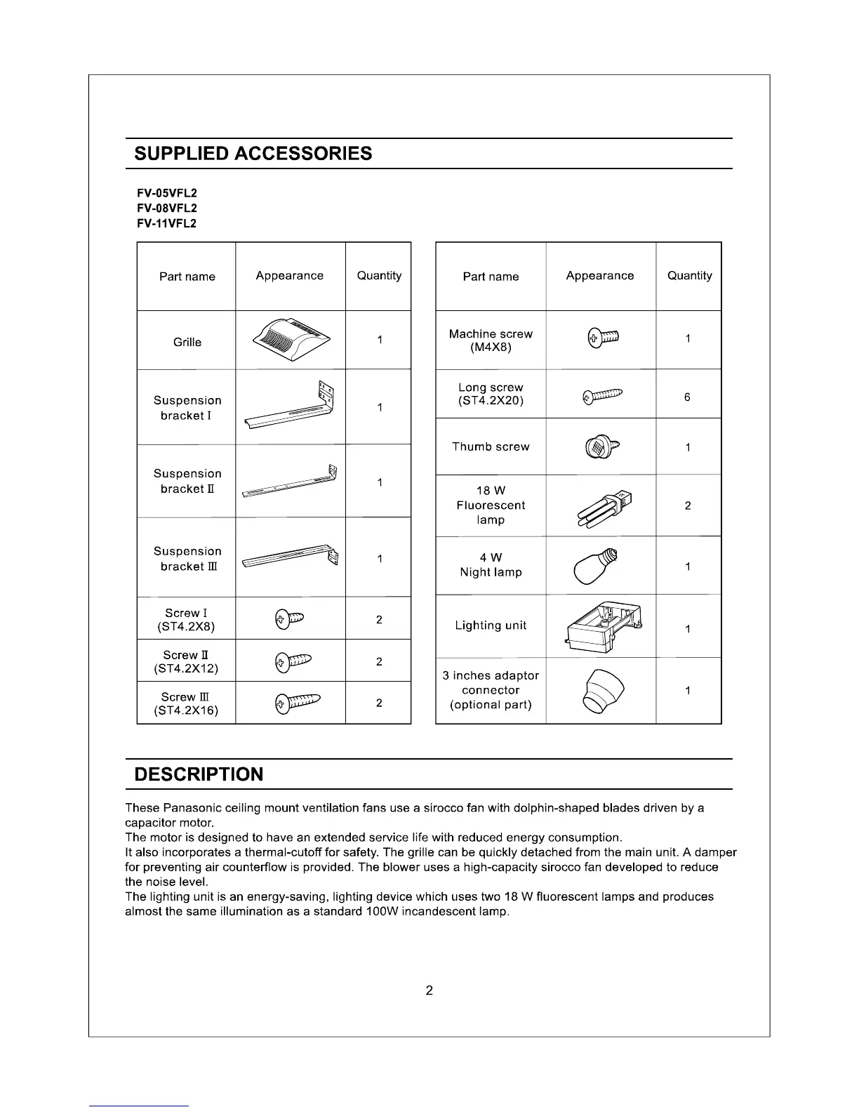 Panasonic FV-08VFL2 - Supplied Accessories; Description