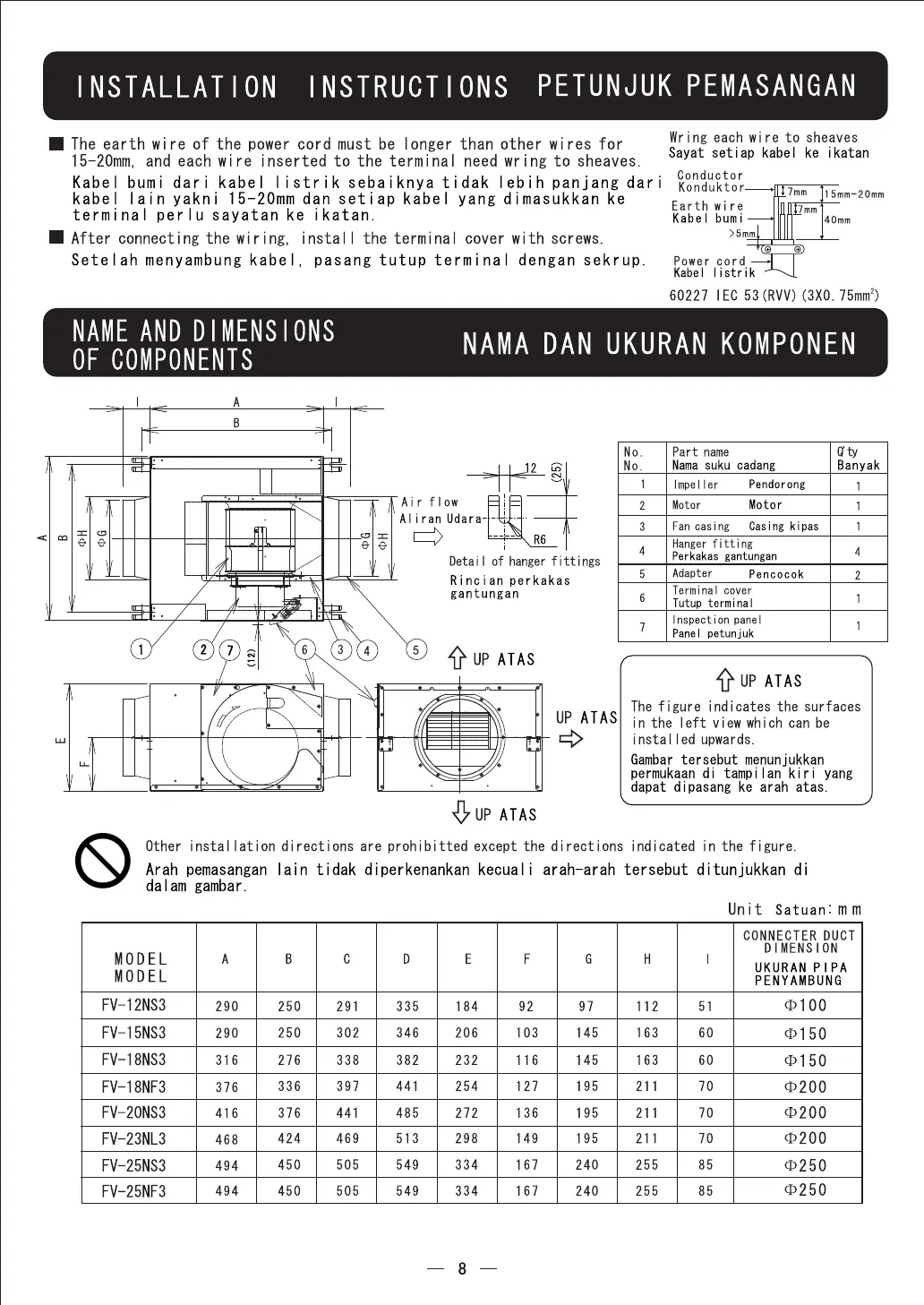 Panasonic FV-12NS3 - Name and Dimensions of Components