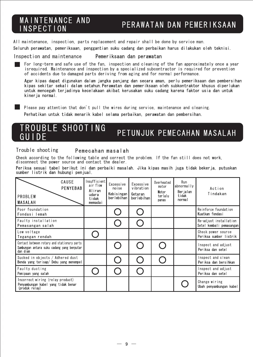 Panasonic FV-12NS3 - Maintenance and Inspection; Trouble Shooting Guide