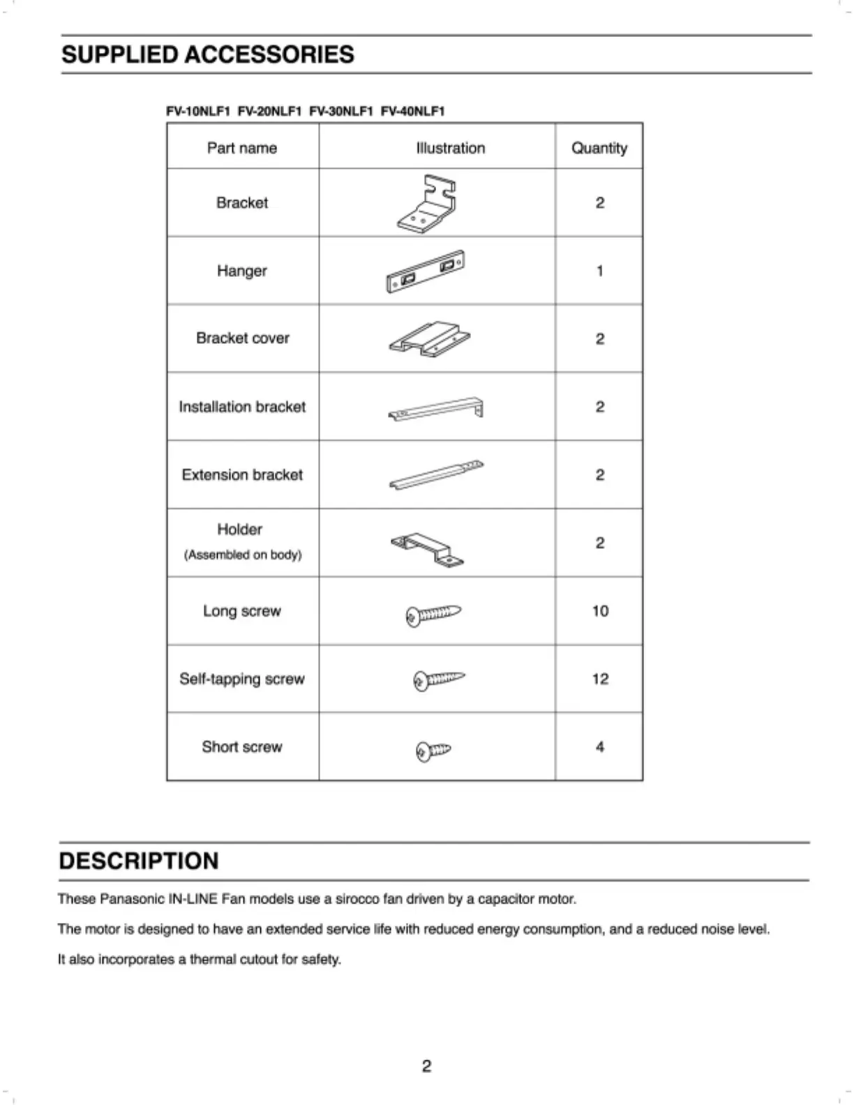 Panasonic FV-40NLF1 - Supplied Accessories; Description
