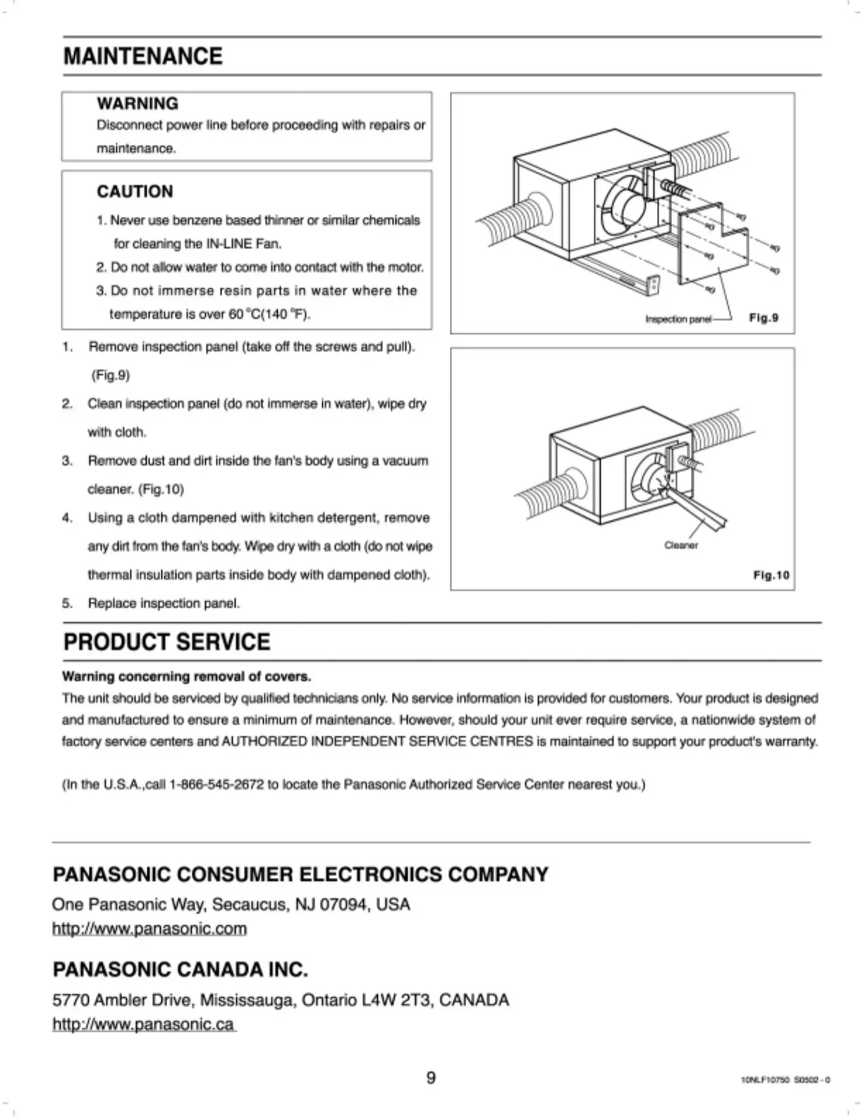 Panasonic FV-40NLF1 - Maintenance; Product Service