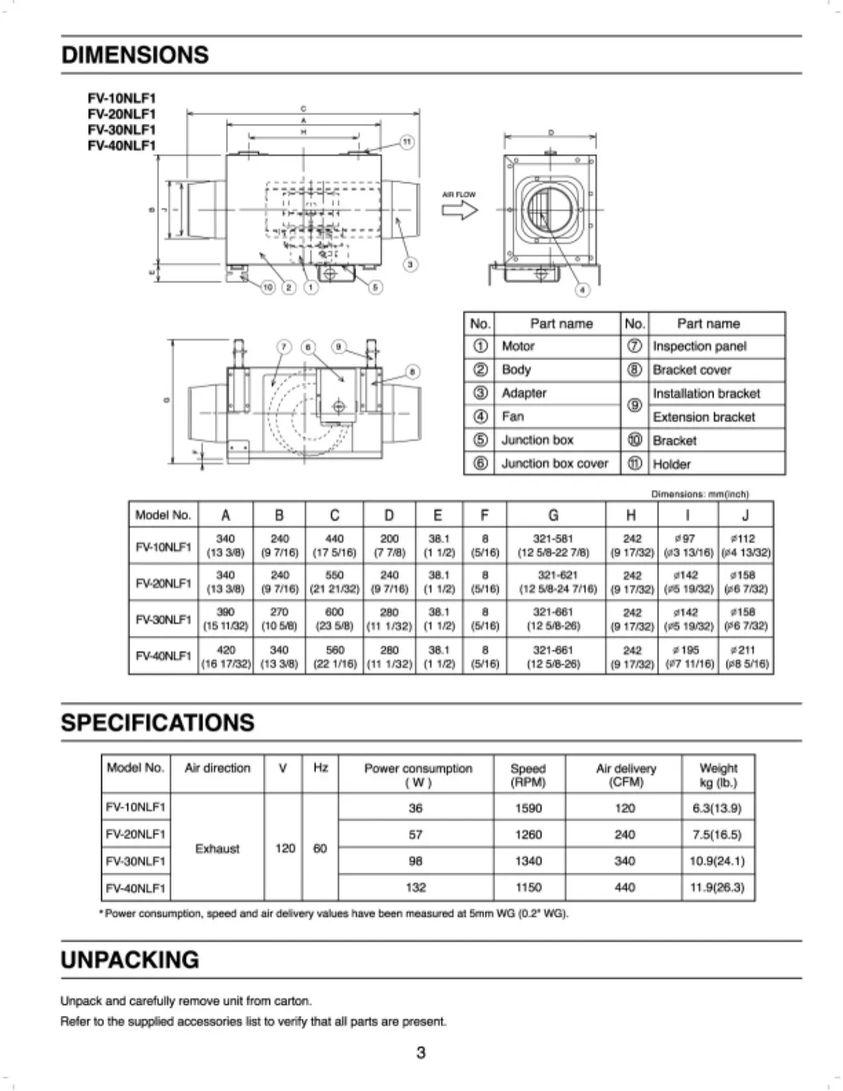 Panasonic FV30VQ3 - Dimensions; Specifications; Unpacking