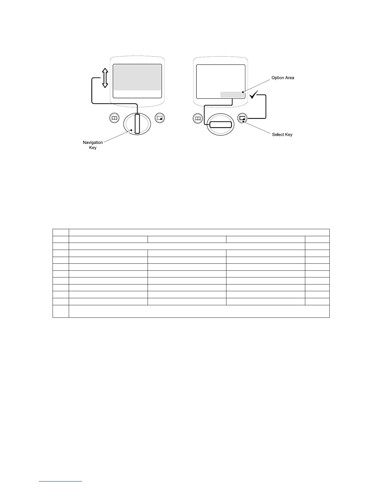 Pressing left and right (f) will scroll through options in the option area of the display. To choose the option press the Select