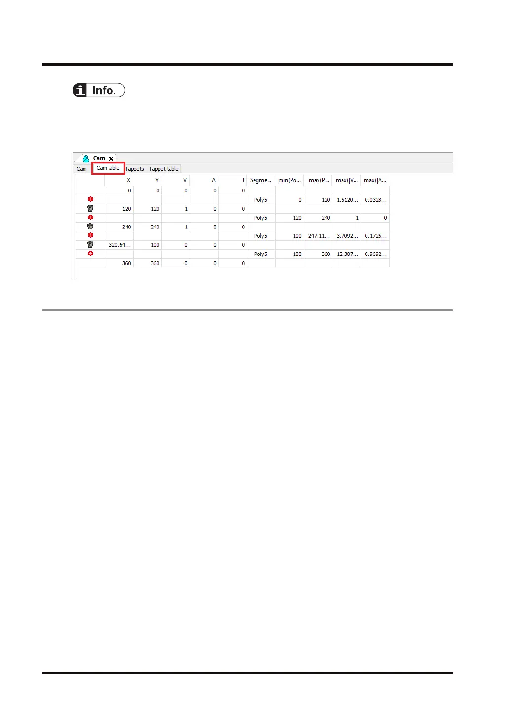 "Cam table" tab. Numerical values that are changed will also be reflected in graphs in the