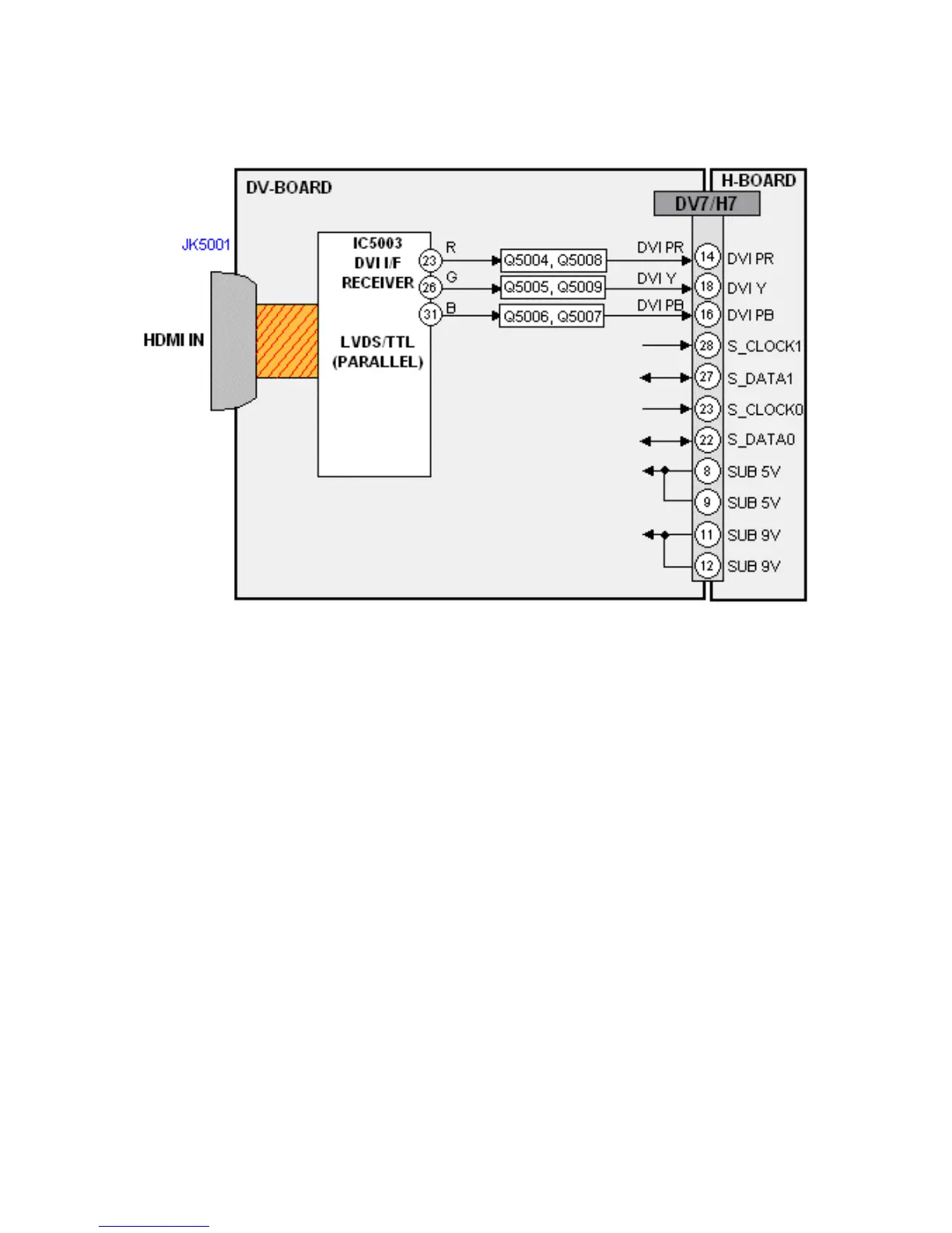 IC5003 of the DV board converts the digital video to parallel analog Y, Pb, and Pr video