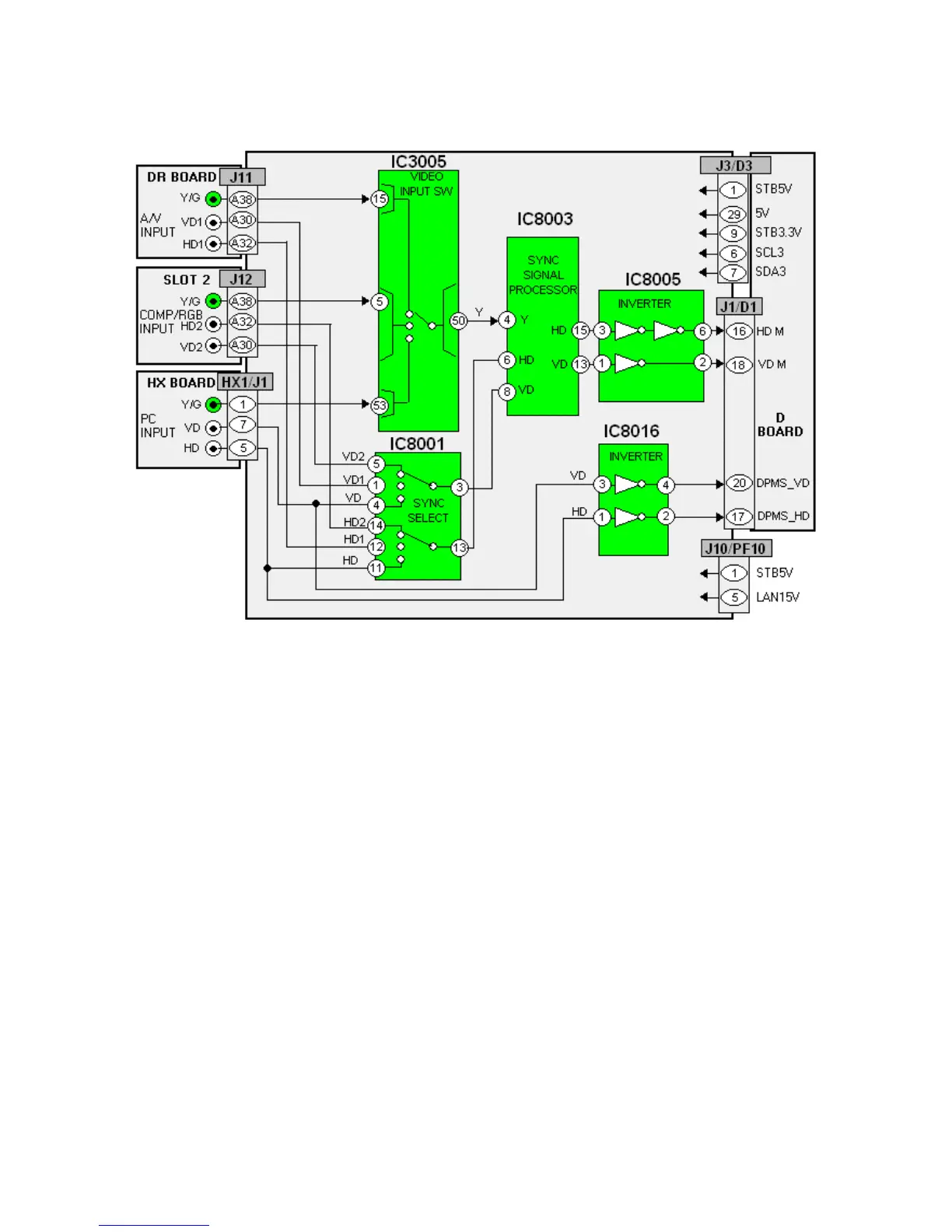 connector J11, J12 or HX1 to the Sync selector IC, IC8001. The selected vertical and