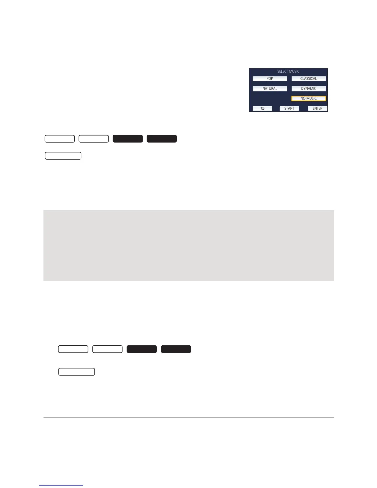 ≥ When [NO MUSIC] is selected, the audio recorded at the time of shooting is played back.