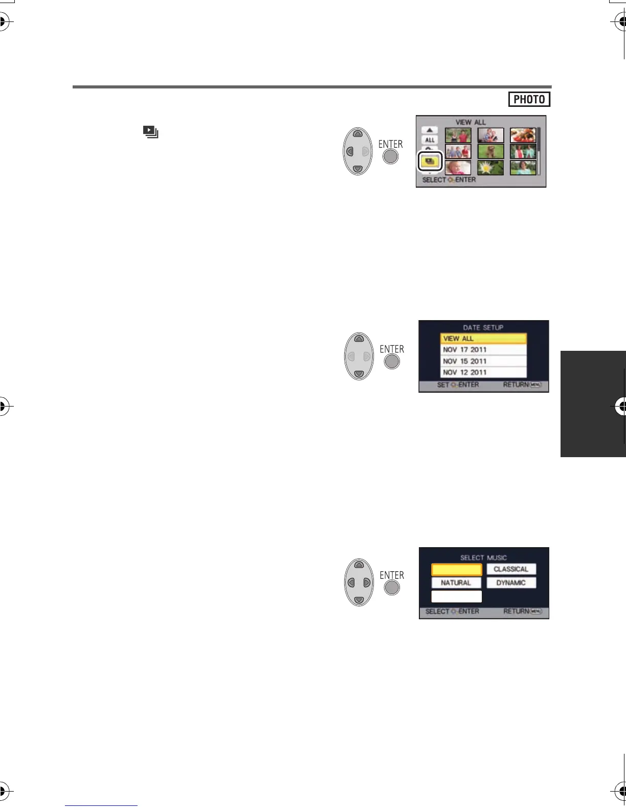 [SLIDE INTERVAL]: Selects the interval between still pictures at playback.
