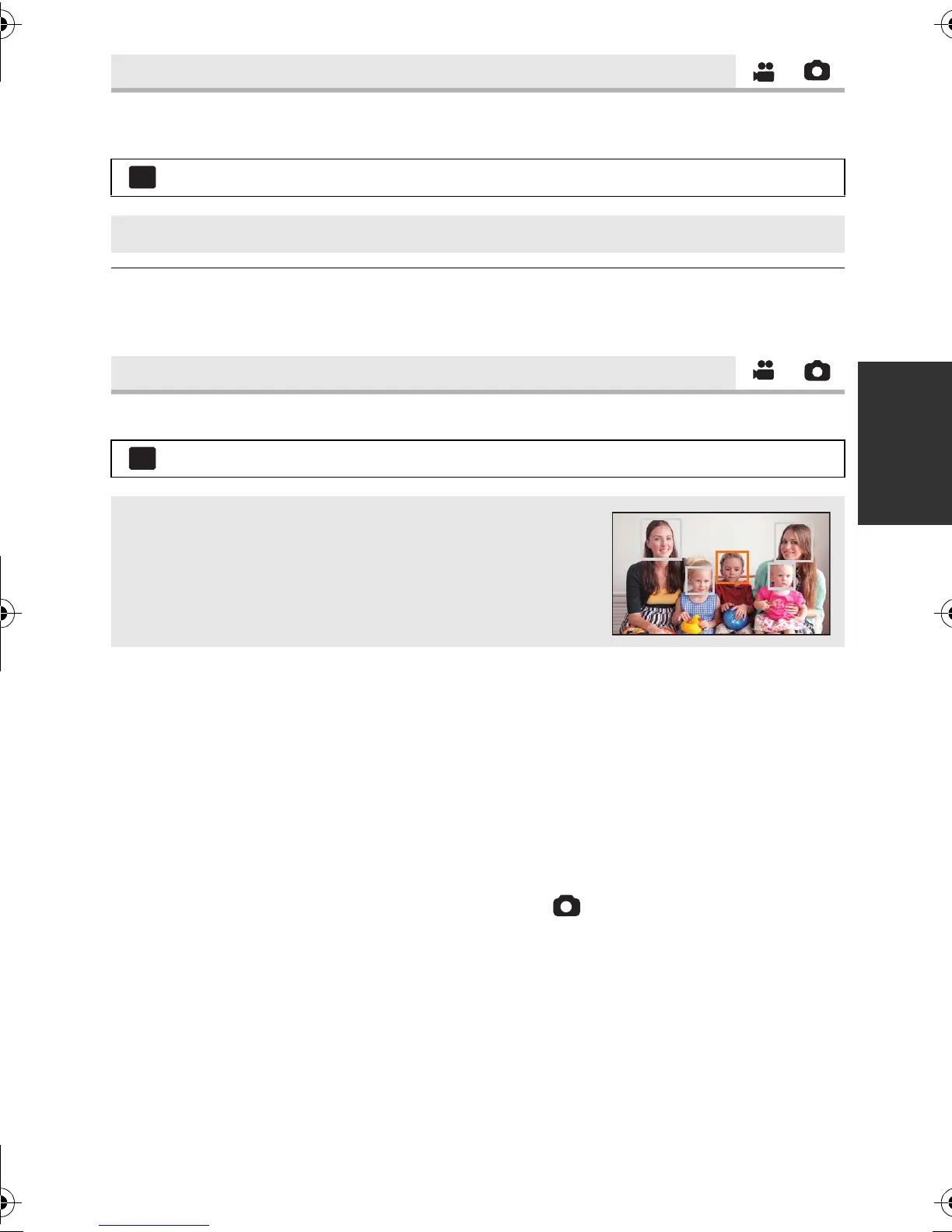 recording still pictures. Prioritised face framing will turn to green when the focus is set.
