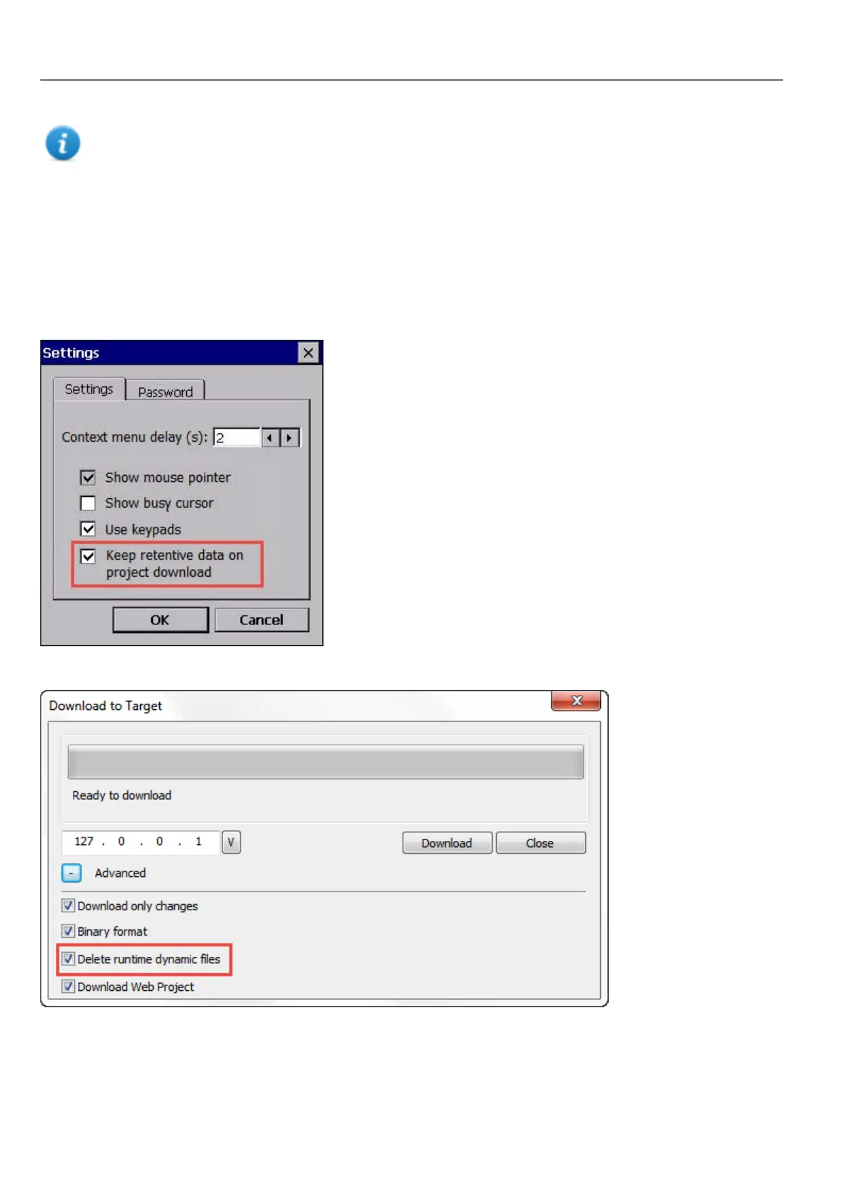 This setting will be ignored if Delete runtime dynamic files option is selected from Download to Target window.