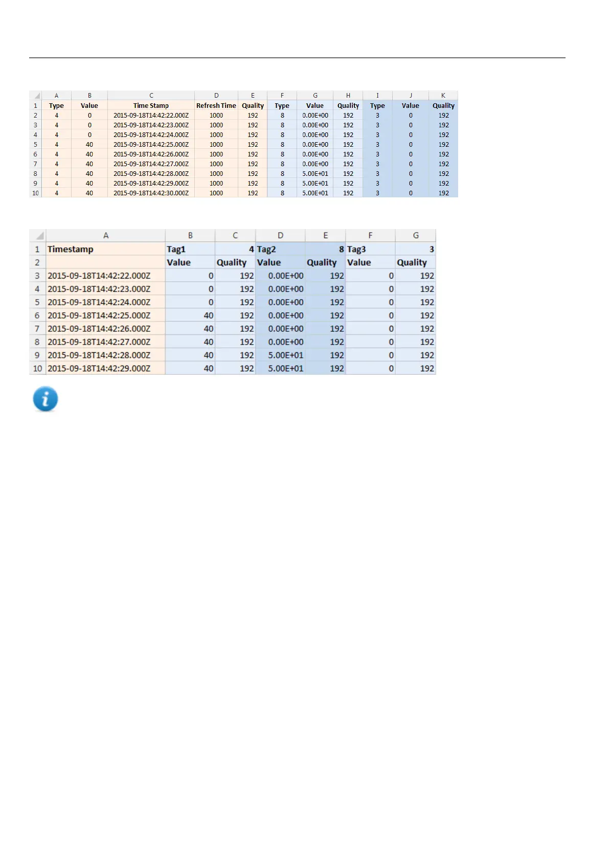 Note: The first row of the header contains the tags names and tags data types