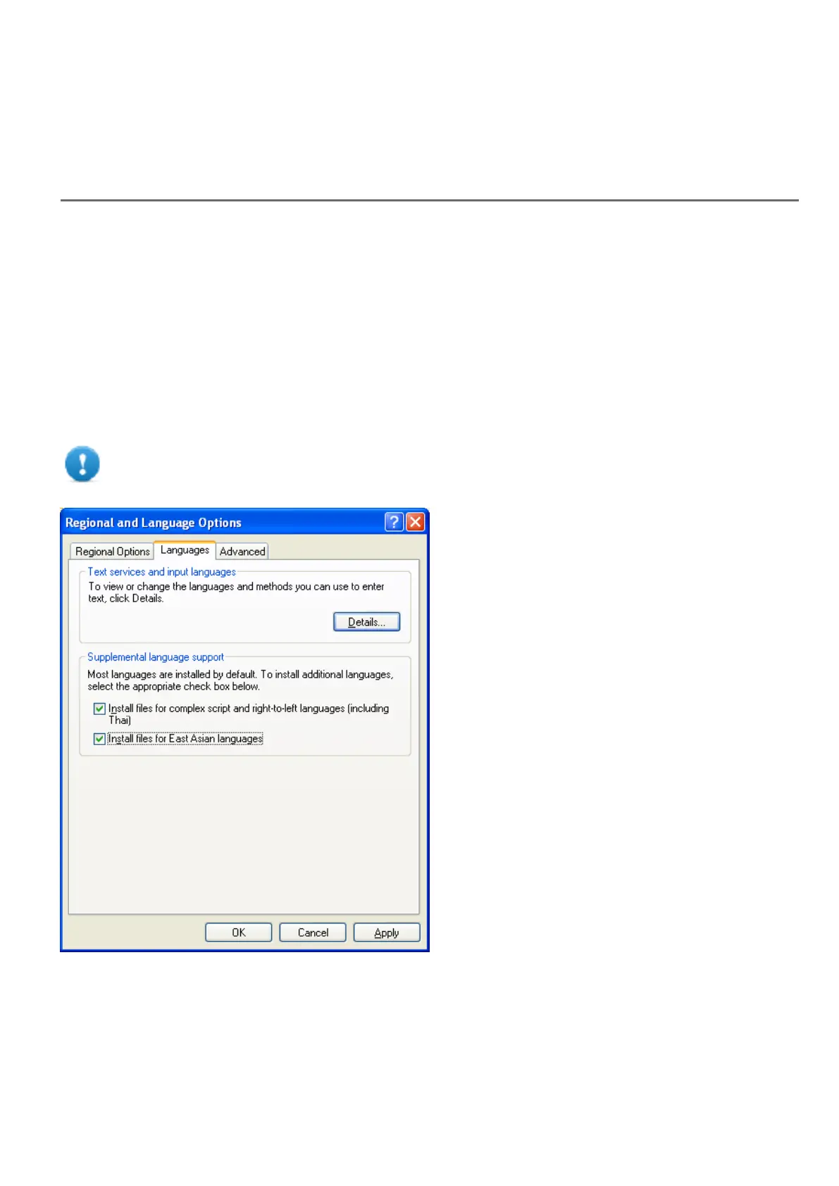 Important: In Windows XP operating systems you have to install the support for complex script and