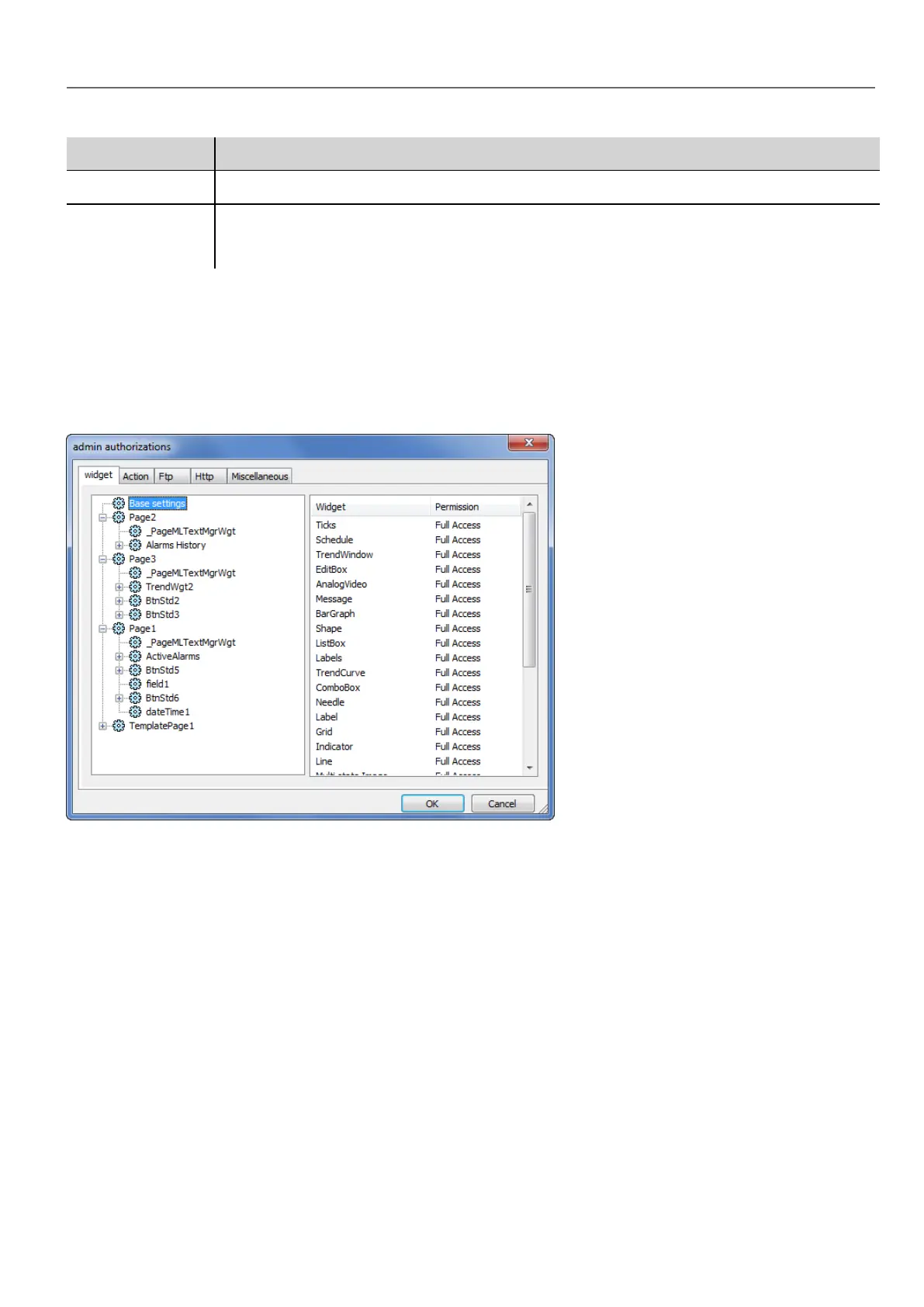 Click the button: a dialog appears with a list of widgets and actions. You can modify access permissions for each one in the