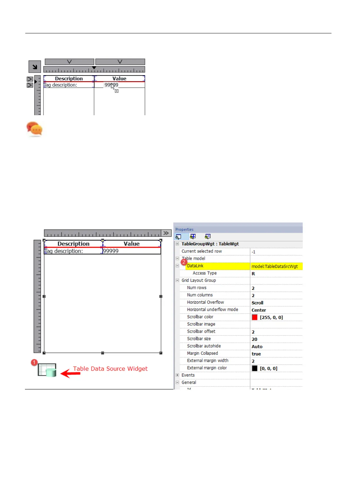 Select the Data Source and inside the TableDataSrcWgt Editor add the rows and columns that are needed. In the following